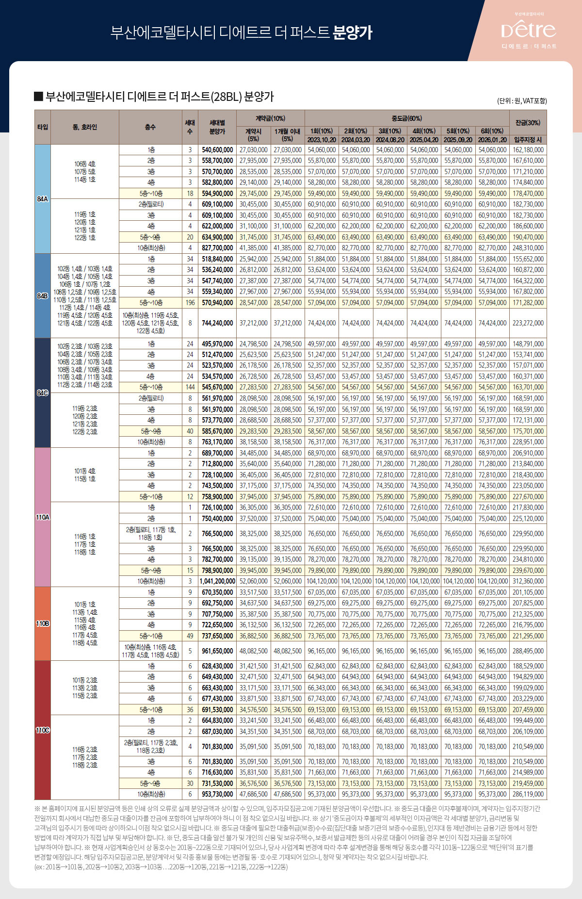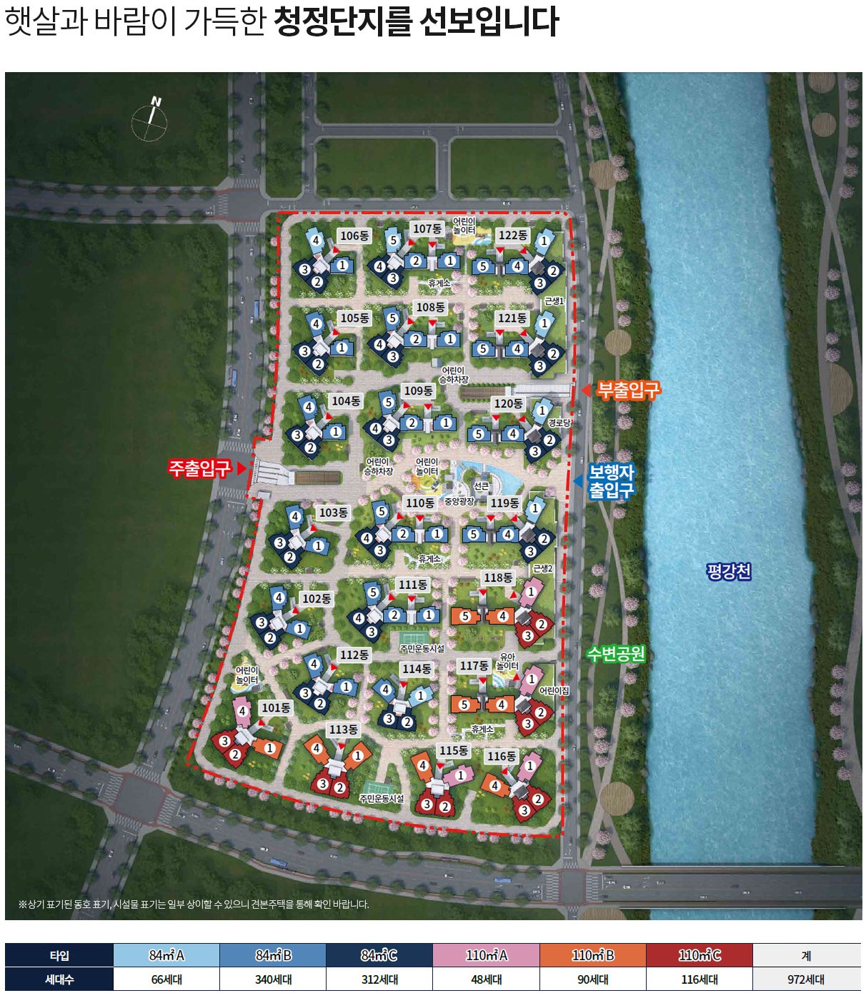 84타입과 110 타입으로 단지가 구성되며, 총 세대수 972세대로 구성됩니다.