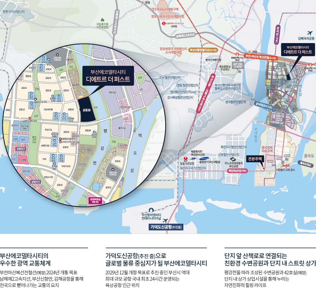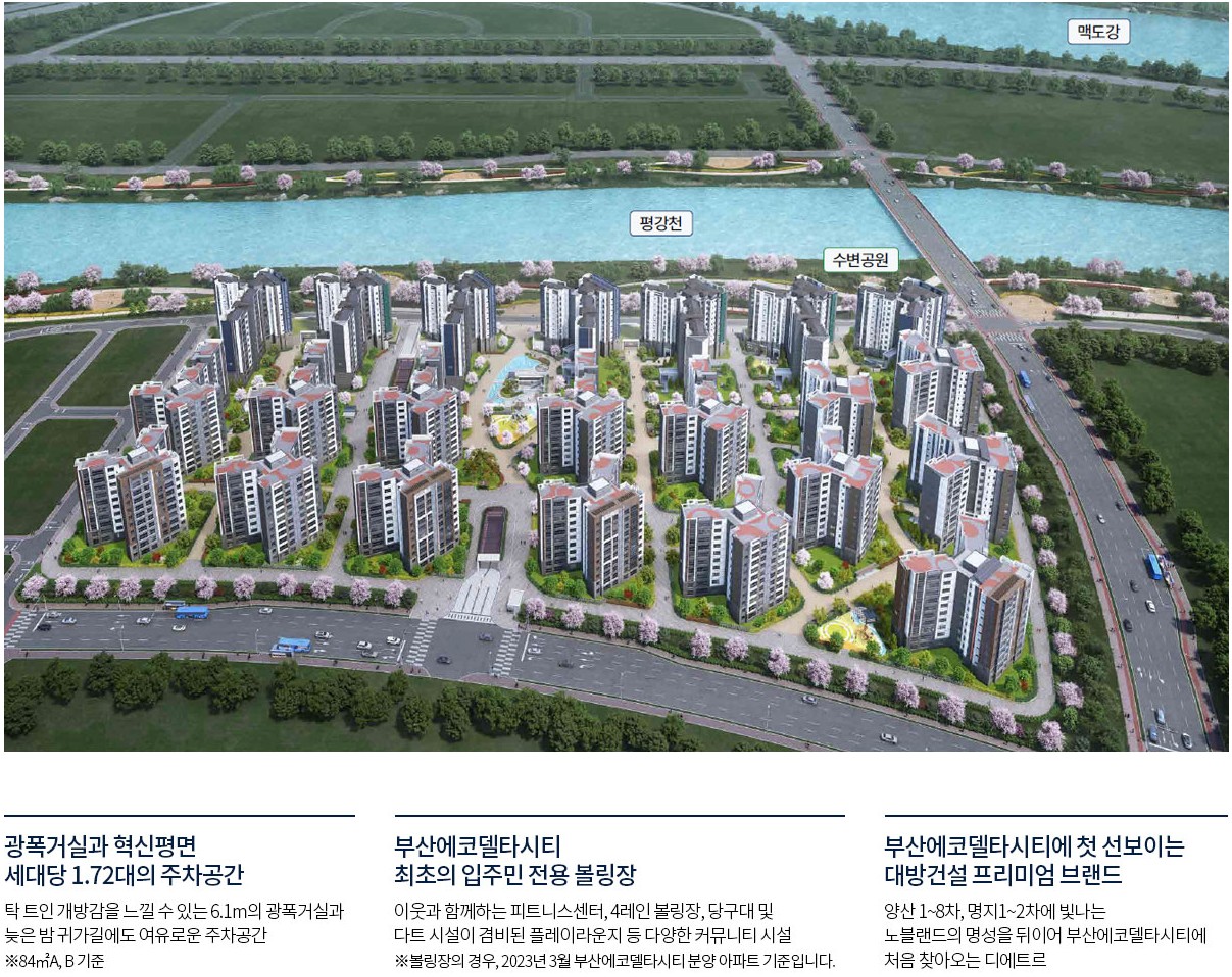 부산 에코델타시티 공동주택용지 28BL에 위치하고 있습니다. 평강천이 바로 옆으로 지나고 있기 때문에 천과 맞닿은 동호실들은 하천뷰가 확보되는 조망권이 상당히 뛰어난 단지입니다.