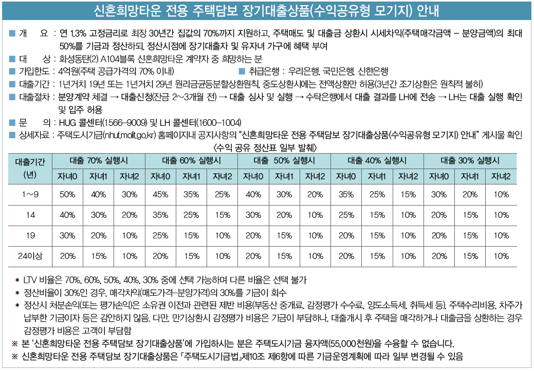 이번 신혼희망타운 공공분양은 신혼희망타운 전용 주택담보 장기대출상품 수익공유형 모기지로 진행된다. 내 마음대로 대출을 받아서 진행할 수 없고, 해당 상품을 이용해야만 하는 조건인데, 자녀의 수와 대출 기간에 따라서 추후 매도 시 매매 차익의 일정 부분을 기금이 회수하는 방식이다.
