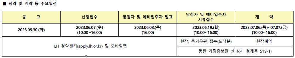 2023년 5월 30일 모집공고 발표 후 6월 7일부터 신청이 이루어진다. 당첨자 및 예비입주자 발표는 2023년 6월 8일이다.