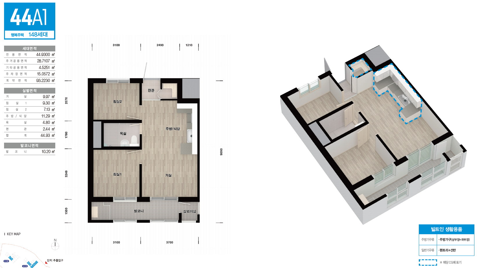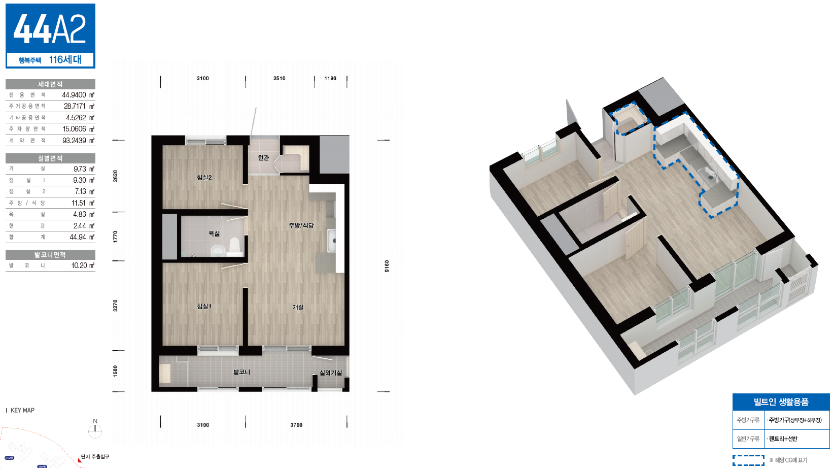 44A1타입은 투룸 구조입니다. 두개의 침실과 거실 및 주방이 설치되어 있습니다.
