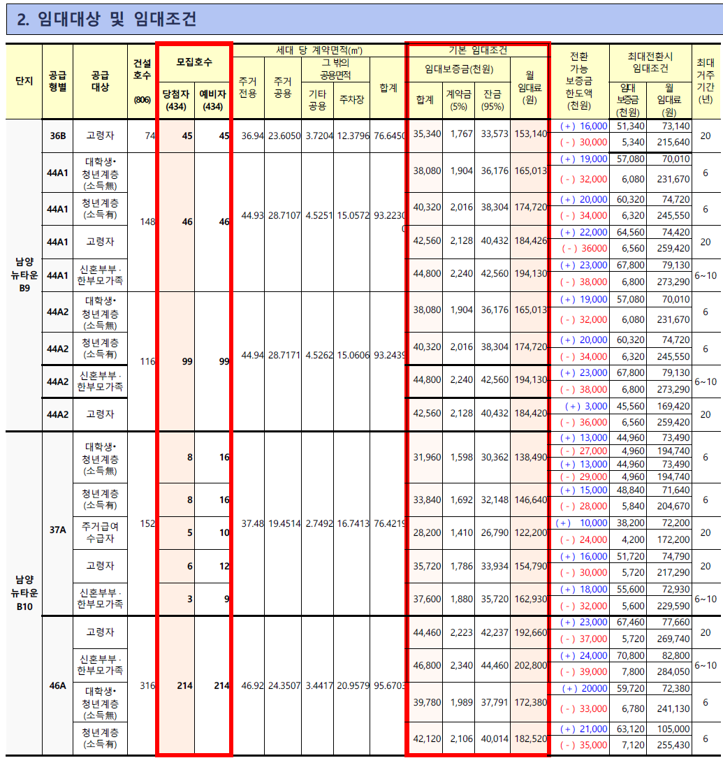 남양뉴타운 B9블록과 B10블록의 현재 모집 중인 타입들과 임대 가격입니다. LH행복주택으로 보증금 및 임대료는 전환 조정이 가능합니다.